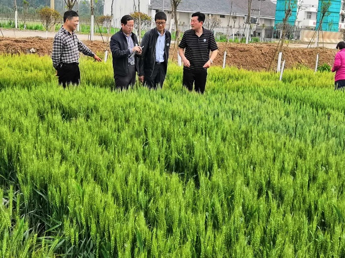 在工信局副局长鲁付森、省级科技特派员程东强、农业农村局副局长王振旭的陪同下,服务团到弱筋小麦扬麦24、扬麦13、扬麦15、郑麦113示范基地察看小麦生长情况,并检查赤霉病防控试验。