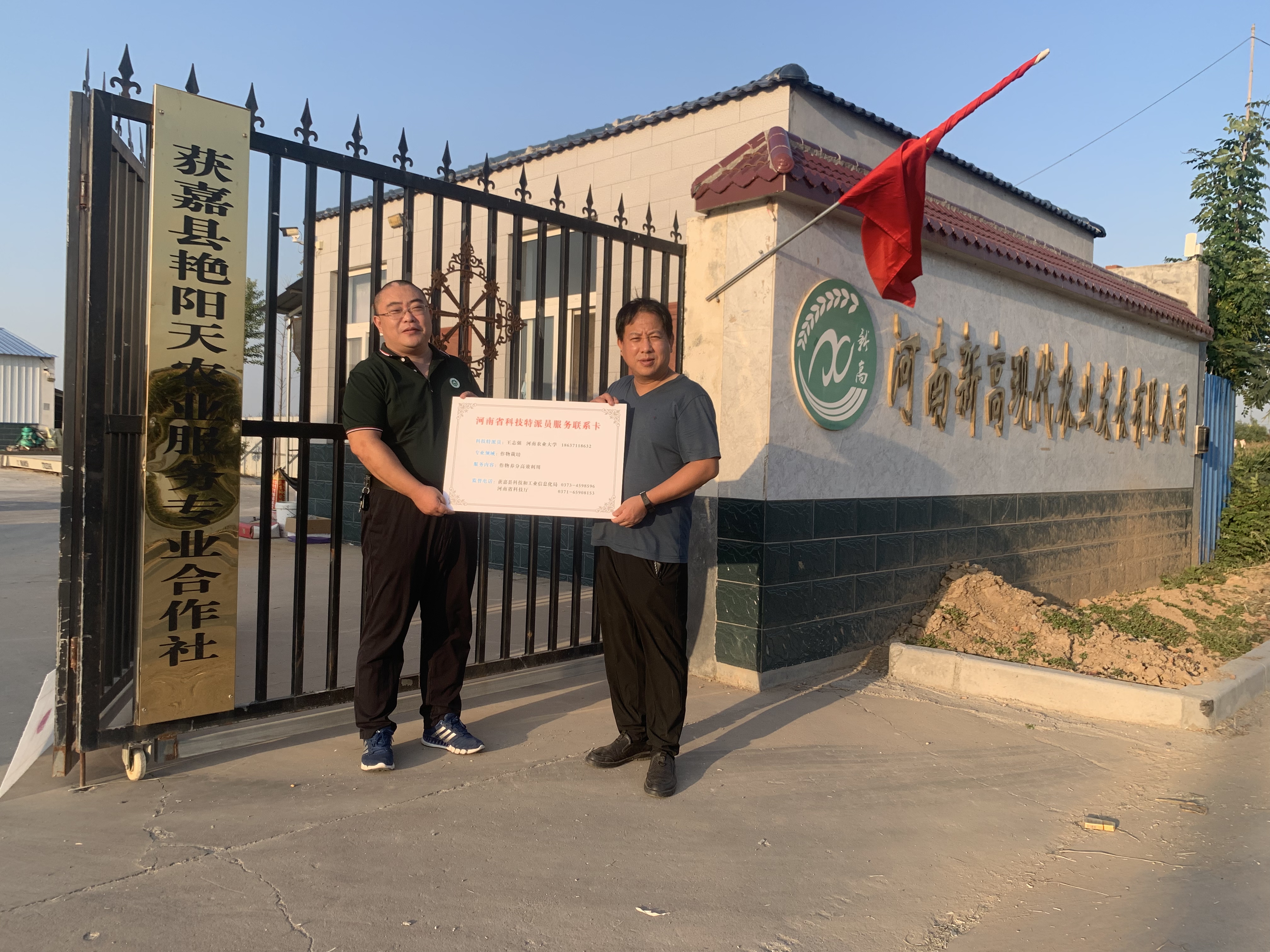 本网讯(通讯员 连延浩) 9月25日,校社会服务处副处长赵建中、河南省科技特派员农学院王志强教授、体育学院王建民老师、农学院连延浩博士一行4人赴新乡获嘉县开展科技服务。在获嘉县艳阳天农业服务专业合作社,王志强教授与合作社负责人徐方子进行了工作对接和技术交流,并举行了“河南省科技特派员服务联系卡”挂牌仪式。