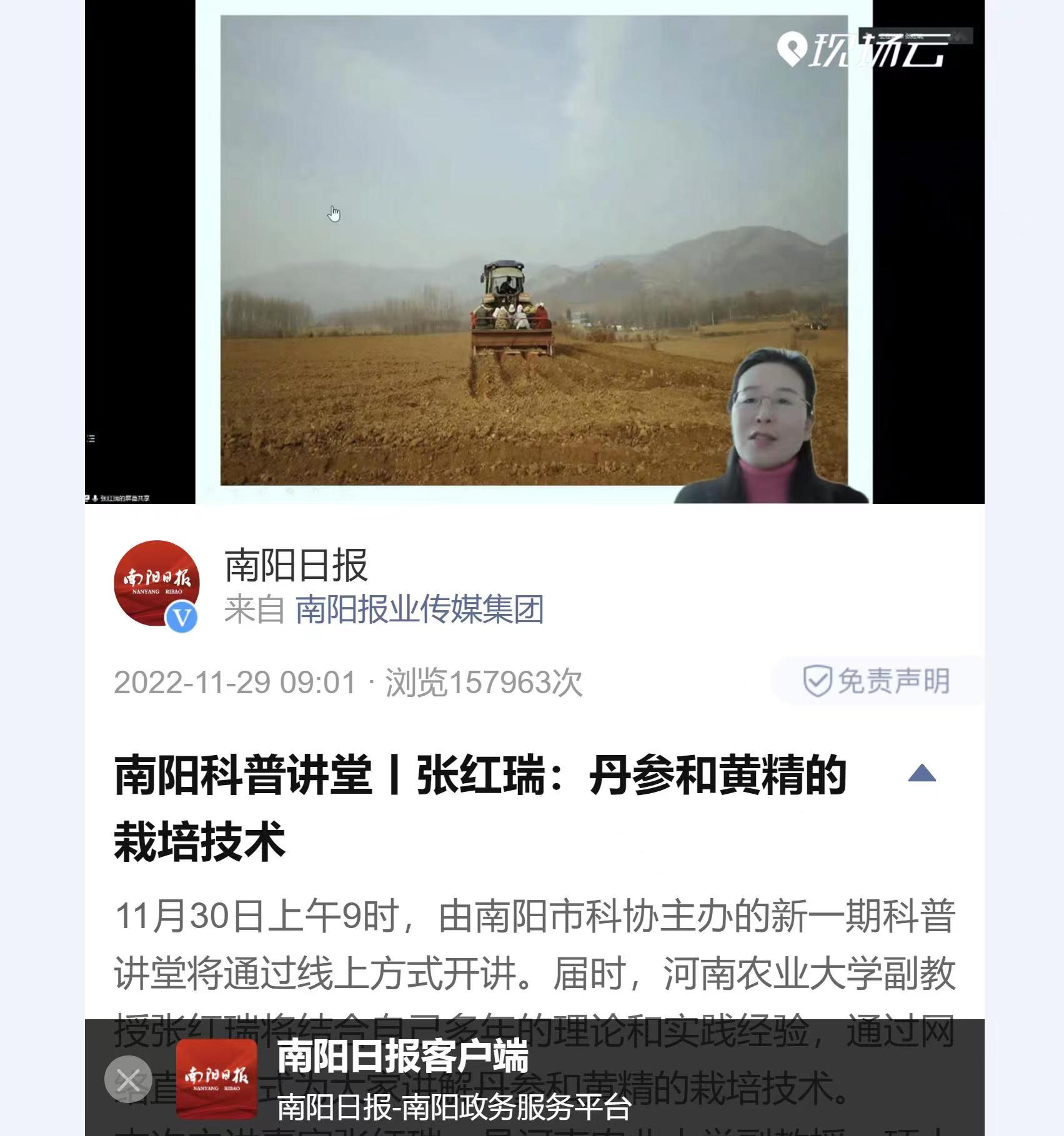 本网讯(通讯员 张红瑞)为确保疫情防控和中药材冬季管理两手抓、两不误,统筹做好中药材冬季管理各项工作顺利进行。2022年11月30日上午,河南省中药材科技特派员服务团(方城)成员、河南省科技特派员农学院张红瑞副教授通过南阳市科协主办的科普讲堂,面向中药材生产管理部门和基层种植户,以网络直播方式讲解丹参和黄精的栽培关键技术。