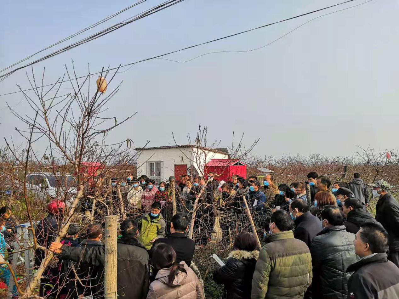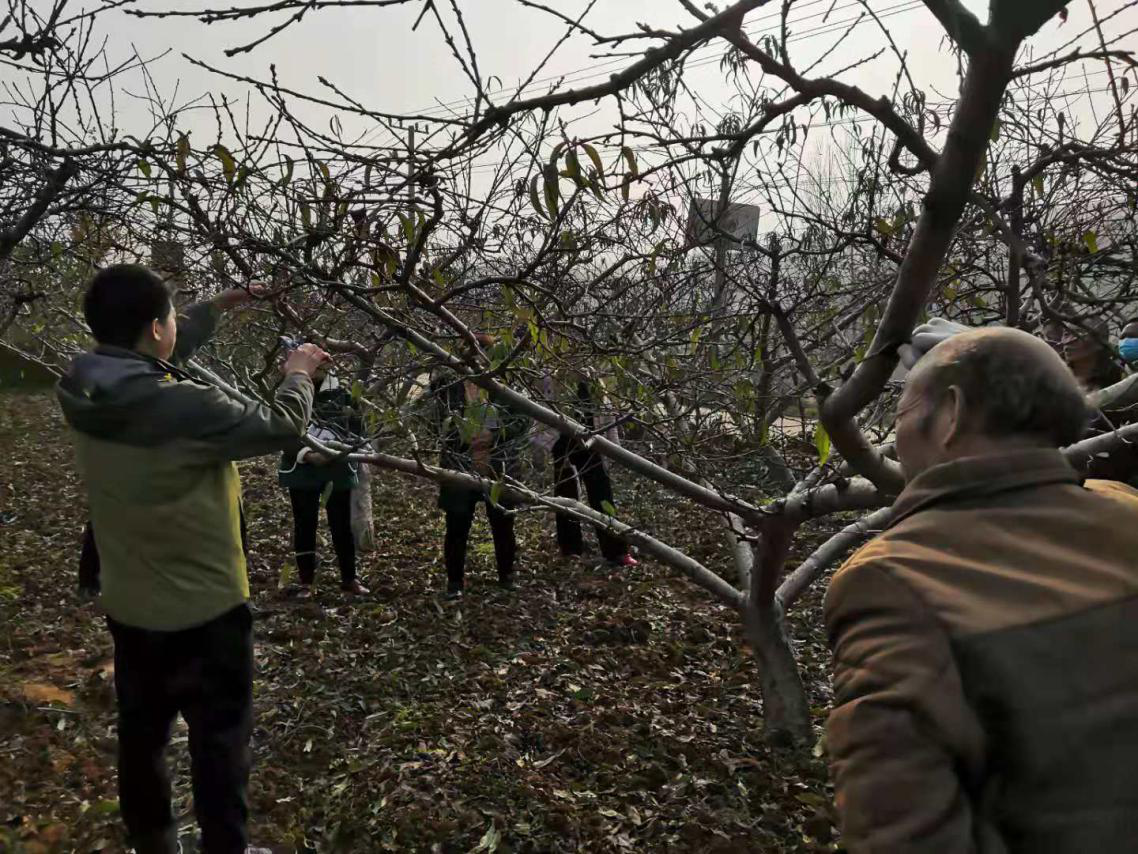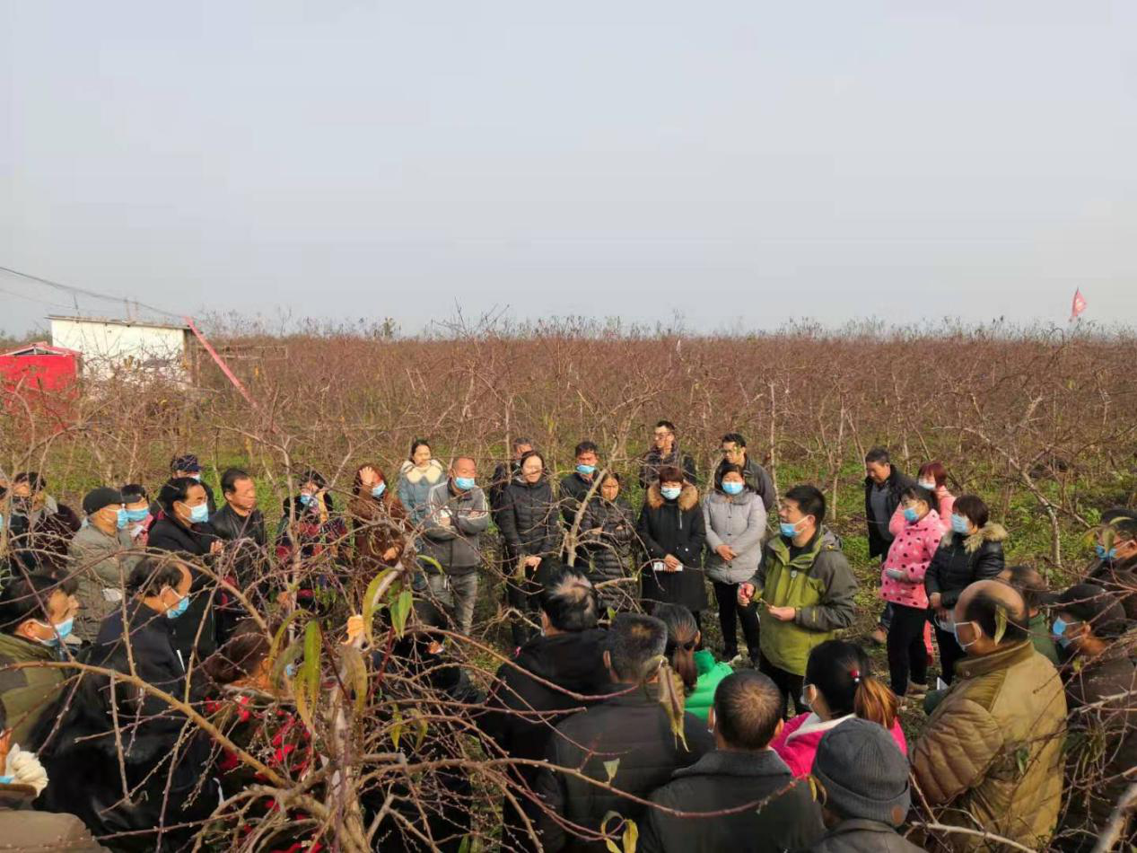 上午在叶县科技局副局长黄军耀的带领下,服务团一行首先来到常派庄村万亩桃园进行桃树冬季修剪指导。现场免费给桃农们发放桃树栽培技术书籍、签字笔和口罩,桃农们热情高涨。郑教授现场教授主干形桃冬季修剪要点,郑教授说修剪的目的是要通风透光,还要掌握三个一原则,就是果树上的任何一个枝条,在一天时间内,任何一段时间都能接受到太阳光的照射。修剪前要“一看二算三下剪 ”, 冬季修剪的重点任务是结果枝组的更新复壮。对于结果枝的修剪推荐“长枝修剪法”,即“只疏不截”,具体方法是:疏去直立枝、下垂枝、密挤枝、病虫枝,结果枝之间的距离平均掌握在20cm左右。剪后的果树要做到四稀四密,即上稀下密、外稀内密、南稀北密、大枝稀小枝密,大枝亮堂堂,小枝闹嚷嚷。修剪示范后郑教授又现场对桃农们遇到的个性问题进行答疑。