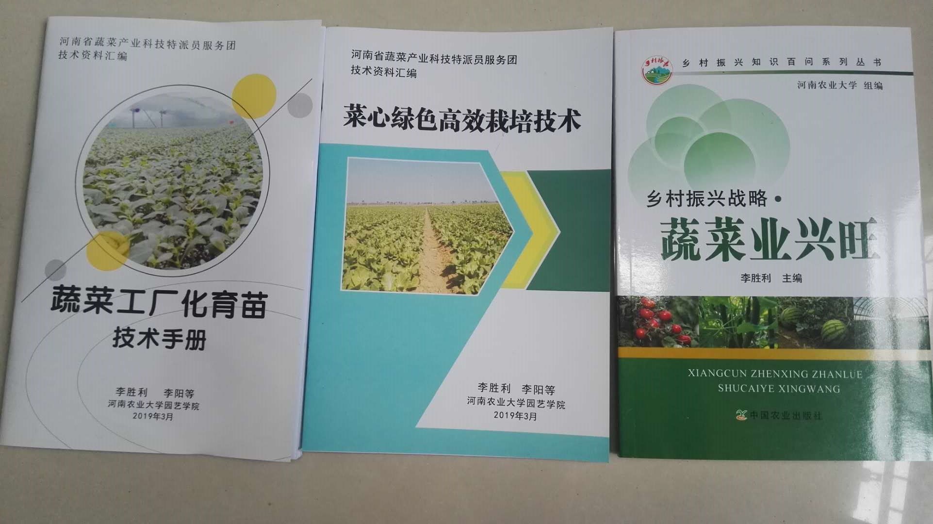 6月23日上午,服务团来到河南丙玉蔬菜种植专业合作社,参观了有机蔬菜种植园区,针对有机蔬菜病虫害的生物防治提出科学措施。服务团为社旗县工业和信息化局相关部门提供了由李胜利教授、李阳老师根据当地产业布局精心编制的《菜心绿色高效栽培技术》、《蔬菜工厂化育苗技术手册》、《乡村振兴战略·蔬菜业兴旺》等600余册技术材料,以供全县各种植户、园区免费领取。