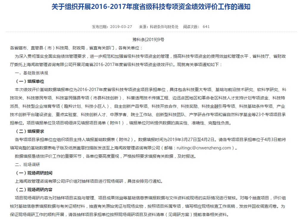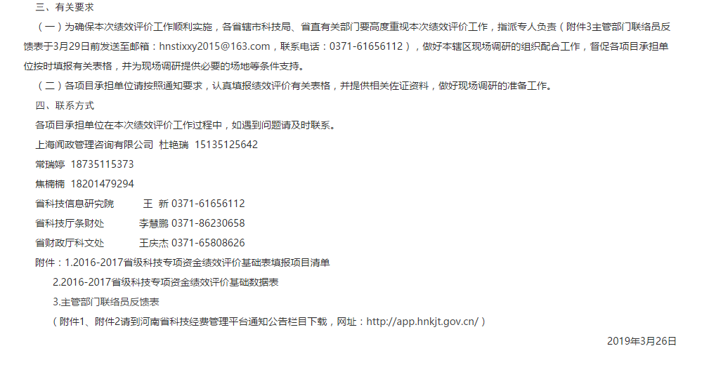 根据省科技厅、财政厅通知要求,拟开展2016-2017年度省级科技专项资金绩效评价工作,请各项目负责人严格按照要求准备材料,科技厅、财政厅将对所填数据进行现场复核。省级科技专项资金绩效评价基础数据表(一式两份)请于4月2日前将加盖财务章后报送至科技处办公室(行政楼408),电子版发送至科技处邮箱hnndkjc@126.com。